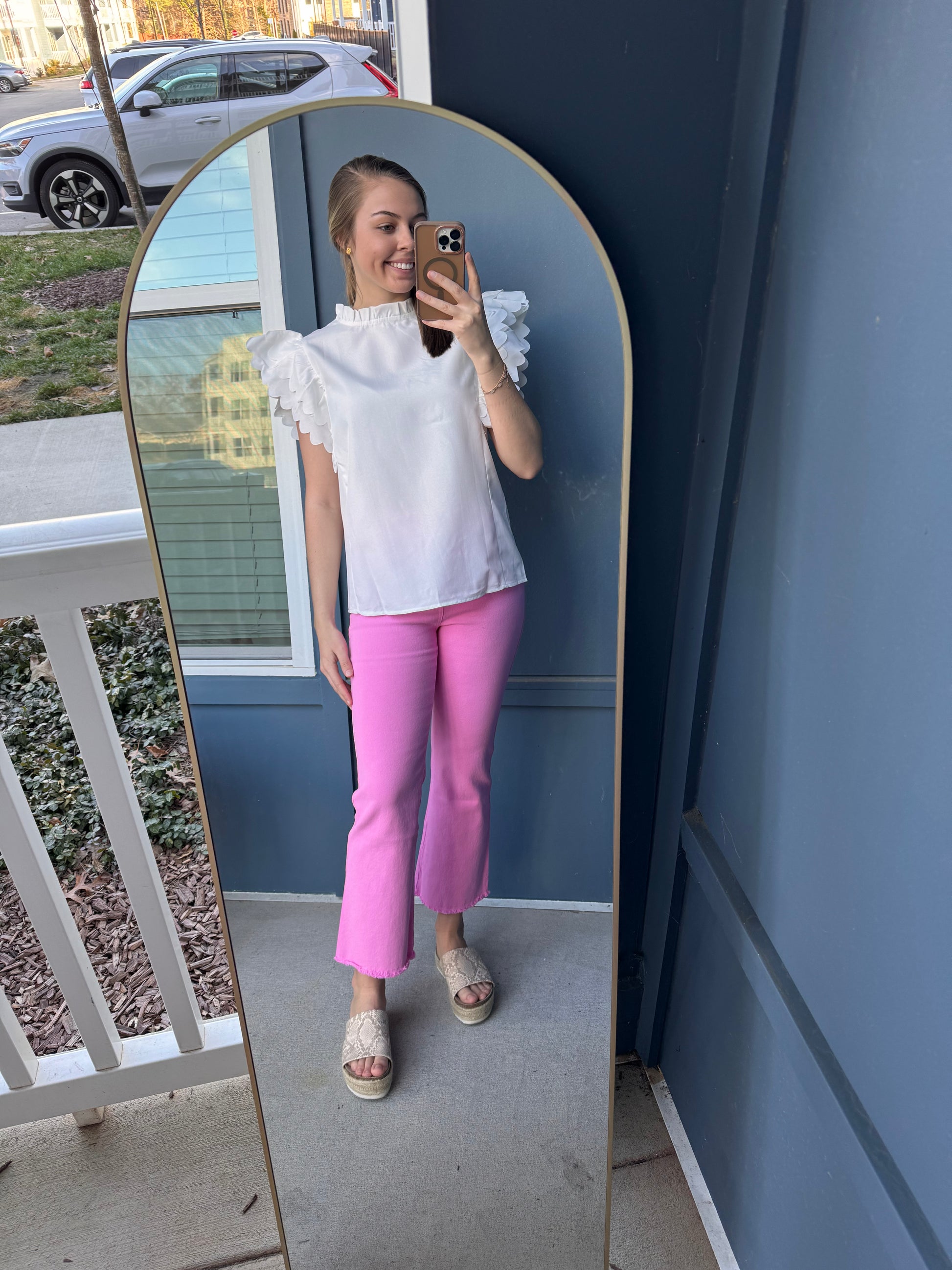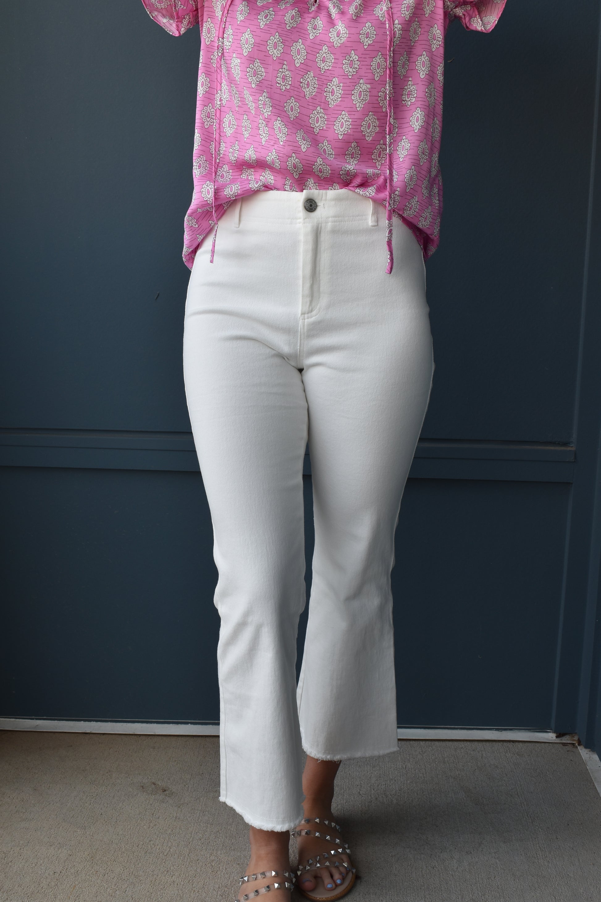 Model in white pants is wearing a MEDIUM
